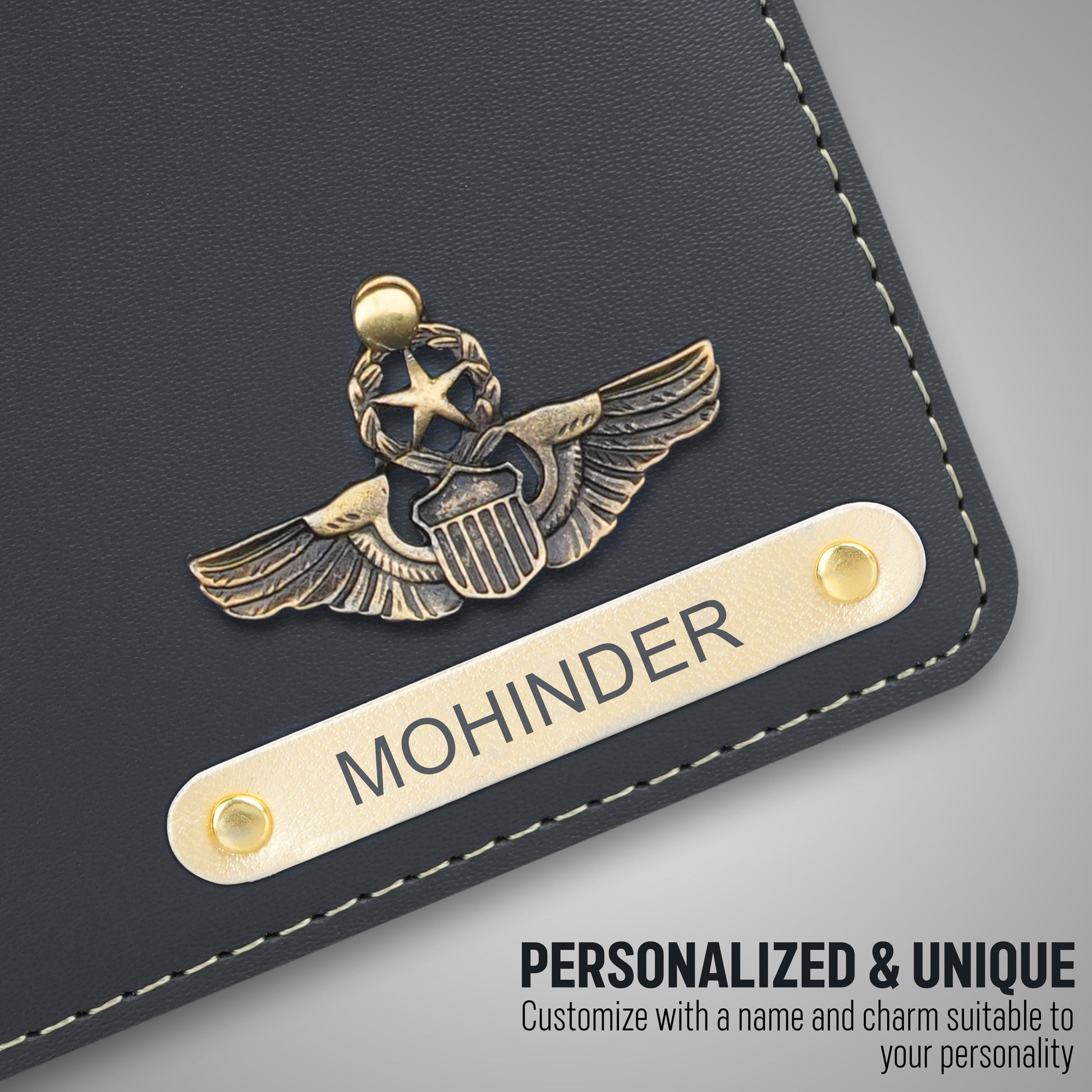 Customization: Personalize with your name and a charm, beautifully embossed on a golden strip for a refined finish